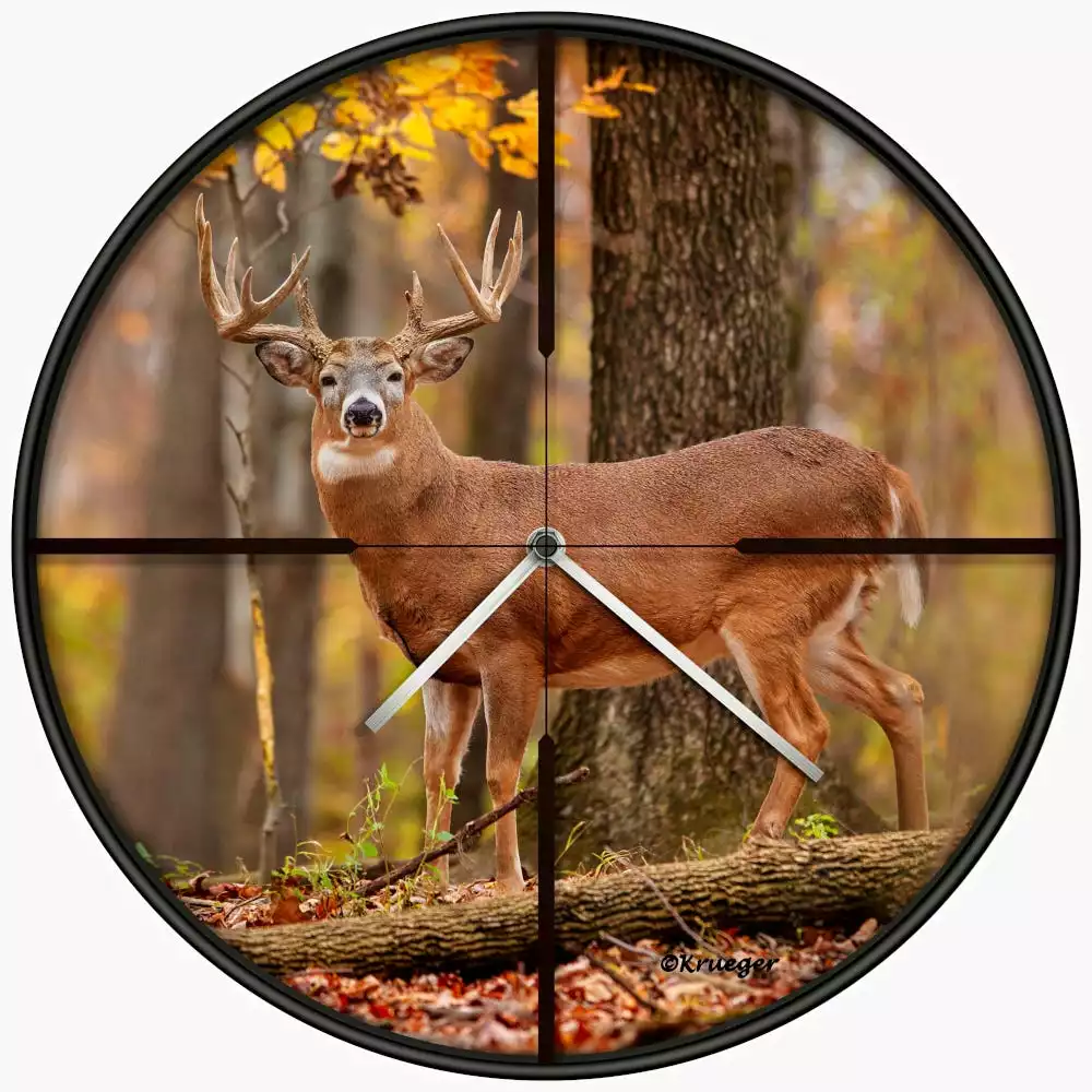 14″” AIM Hunting™ Wall Clock featuring high-resolution image of a whitetail buck standing next to a buck rub, from famous wildlife photographer Lance Krueger, in patented crosshairs clock design.