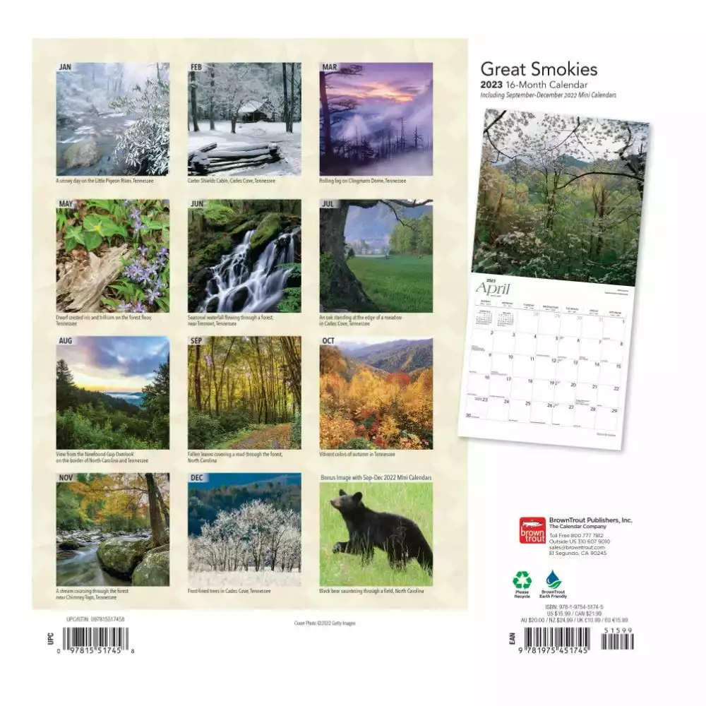 The Great Smoky Mountains, which rise on the border between North Carolina and Tennessee, stretch from the Pigeon River in the northeast to the Little Tennessee River in the southwest. This subrange of the Appalachian Mountains is home to Great Smoky Mountains National Park. This beautiful square wall calendar includes images of the Great Smokies’ ancient mountains, lush forests, and abundant plant and animal life.