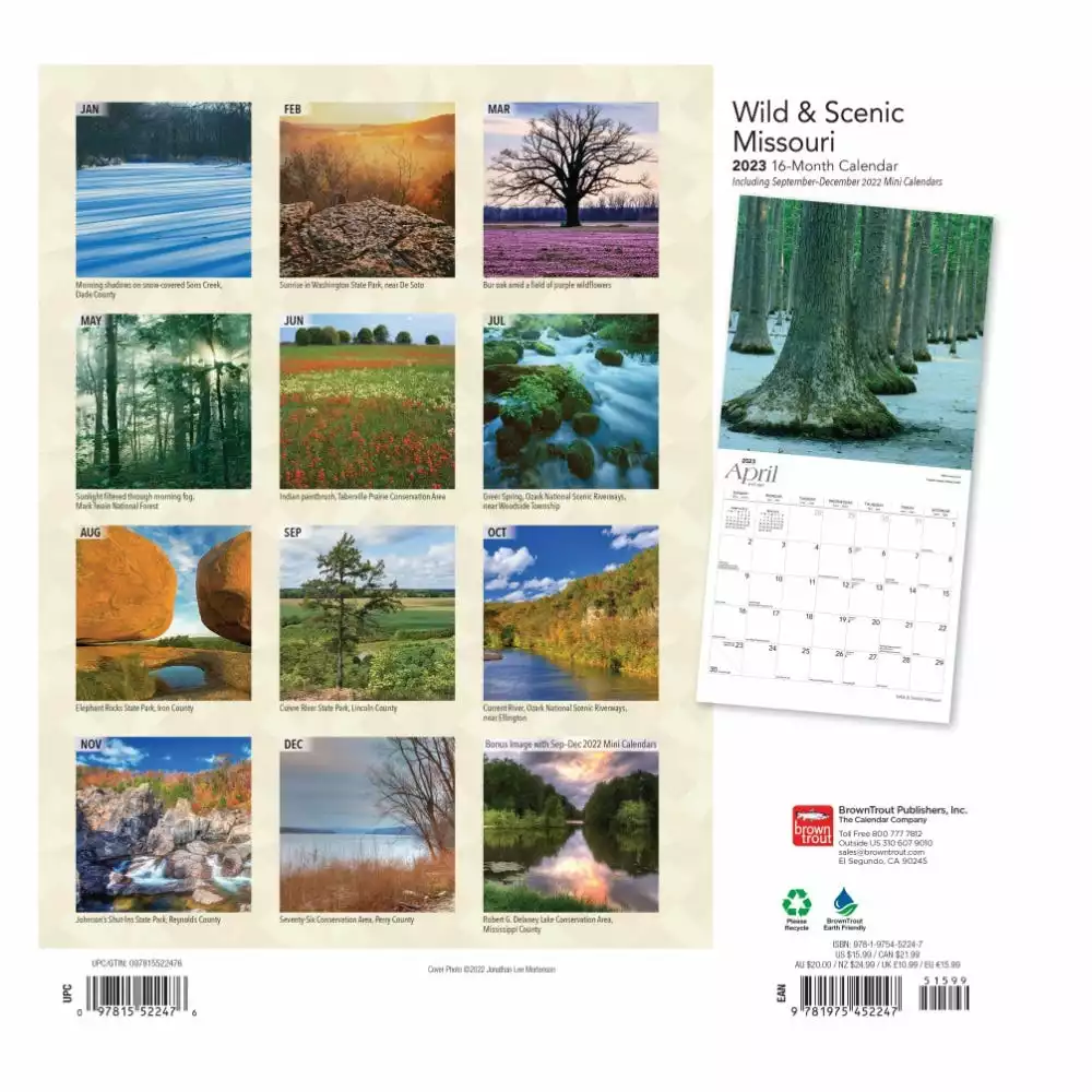 Missouri features an impressive landscape of thriving wetlands, colorful prairies, winding rivers, and more than 1,000 caves. From its lush, sheltering forests to its cool, clear streams, Mark Twain’s home state is a place that encourages peaceful contemplation. Missouri’s natural surroundings impart a tranquility that is impossible to leave behind. Enjoy the serenity of wild and scenic Missouri in this square wall calendar.