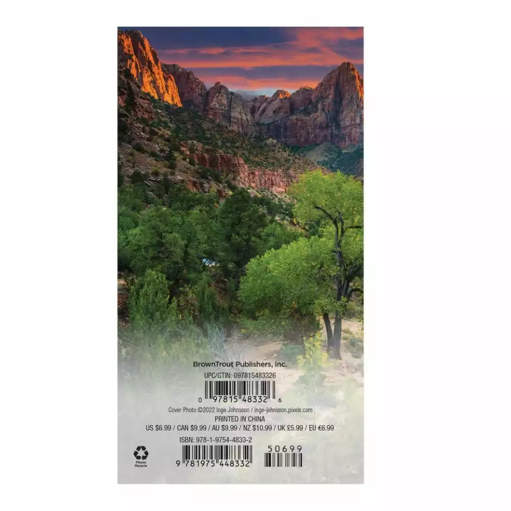 Millions of people visit America’s national parks each year. Thousands volunteer to service and protect these precious lands that present us with such unsurpassed beauty. Featuring a stunning photo of America’s most pristine and spectacular wilderness, this National Parks two-year pocket planner will take you on an inspiring journey through the United States’ most awesome sights. Unfolding from a convenient 3.5″ x 6.5″ size into a 7″ x 6.5″ monthly calendar grid, this format is only slightly larger than a checkbook and fits neatly in a pocket or purse. Notable features include a striking wraparound cover image, planning pages, and several additional pages for notes.
