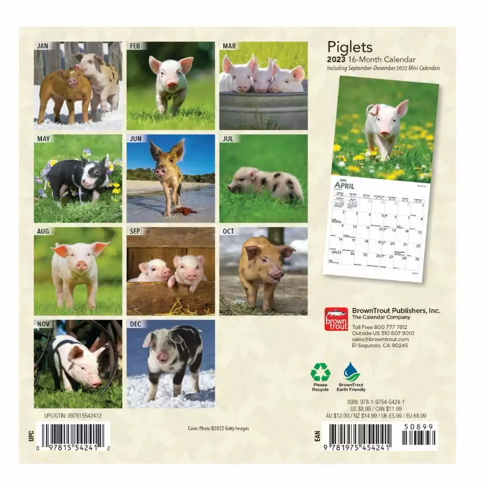 Bring a little piece of the pastoral farm to your home. Watch these cute rascals mill about the yard from month to month. Like adult pigs, piglets are intelligent, curious, and very cute! This mini wall calendar evokes the sweet snorts and squeals of playful piglets.