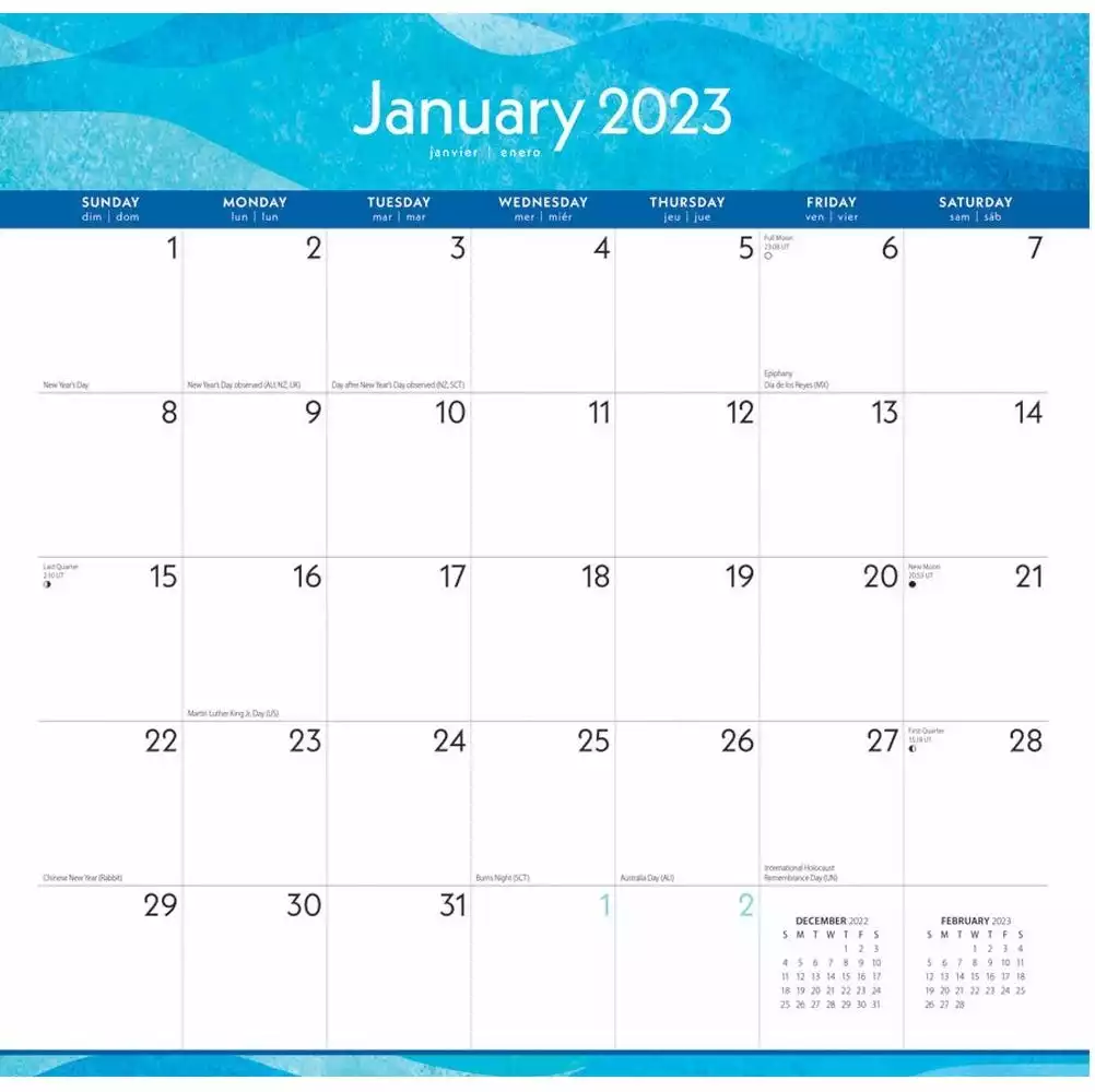 Seaside Currents’ delightful patterns adorn this square office calendar, evoking a sense of timeless tranquility. This 12 x 12 office calendar provides ample room for writing notes and appointments, features a wire-o binding to flip pages and economize space, and features an elegant design.
