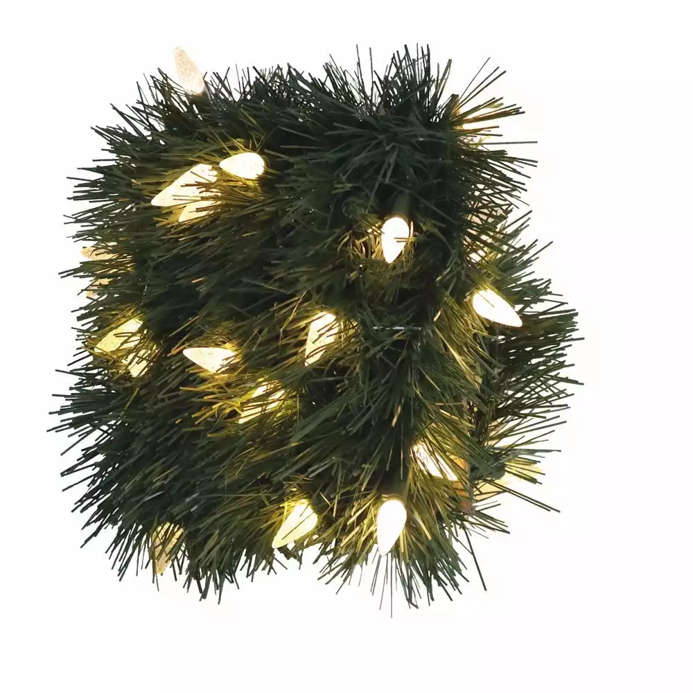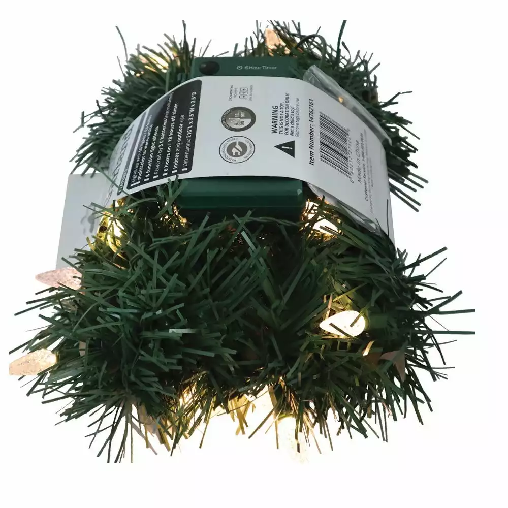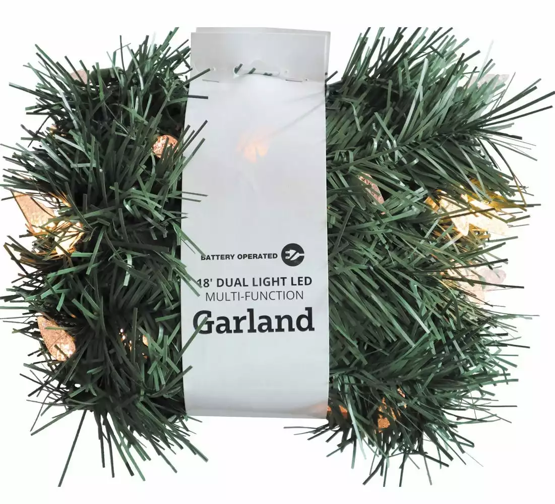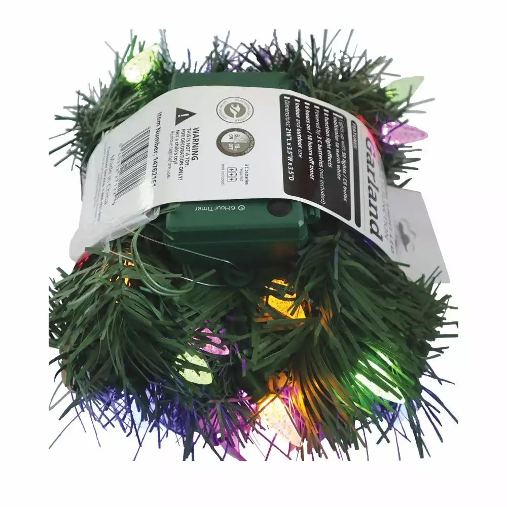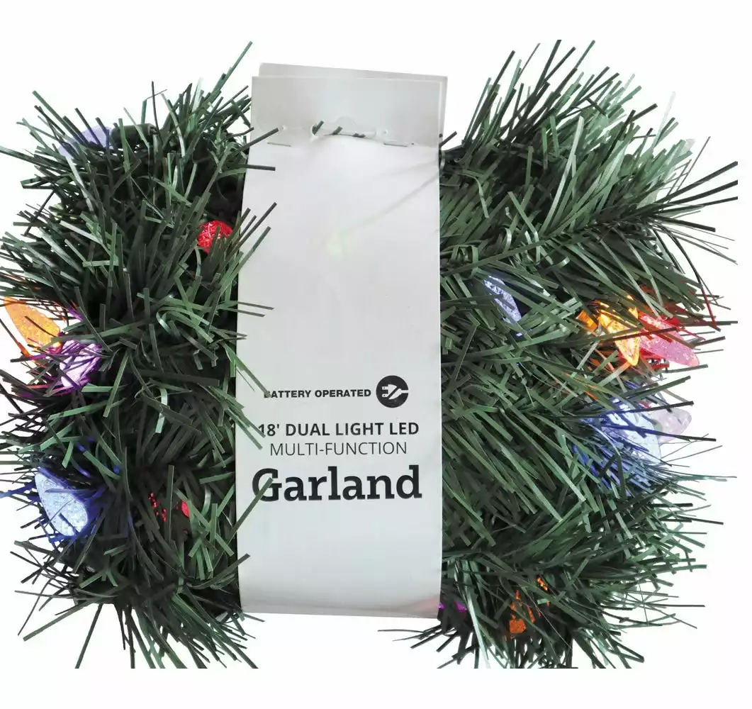 This Battery Operated Pre-lit Artificial Christmas Garland is 18 feet long and decorated with 50 dual color C6 LED lights that change from multicolor to warm white with a (3)C battery box. The bulbs are low-voltage LEDs that are energy-efficient, long lasting and cool to the touch. A separate button controls the functions of 8 different light actions. 6 hours on/18 hours off timed operation. This indoor/outdoor garland can be displayed over doors, windows, fireplace mantels, fence, or stairway railings to add a festive feel to any area of the house.