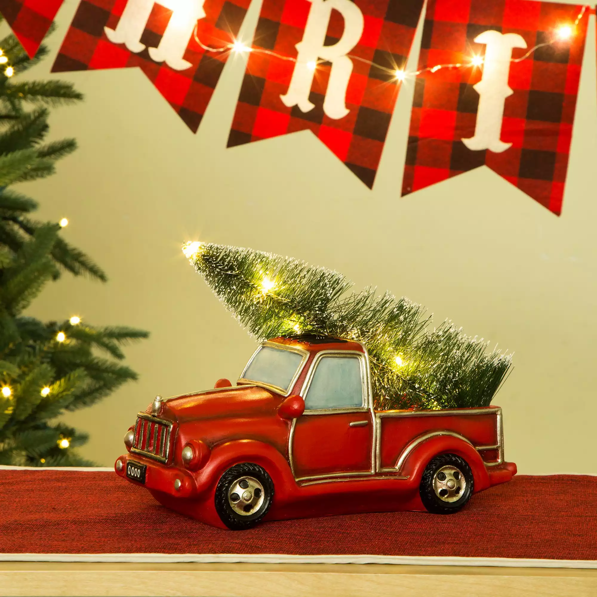Recreate that memory with this table top decor of a red classical truck hauling a Christmas tree in the back. Hit the switch and the lights on the tree light up, adding a warm festive atmosphere to your home this Holiday Season.