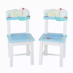 All aboard for a nautical adventure with the Sailing furniture set! This collection features shades of sea, sky, and sandy beaches–decorated with images of cheerful crabs, diving dolphins, soaring seagulls, and sailboats at full mast. These two chairs feature angled leg design to prevent tipping. Perfect for the bedroom or playroom. Adult assembly required. 12.5″W x 12″D x 25″H Seat height: 12″