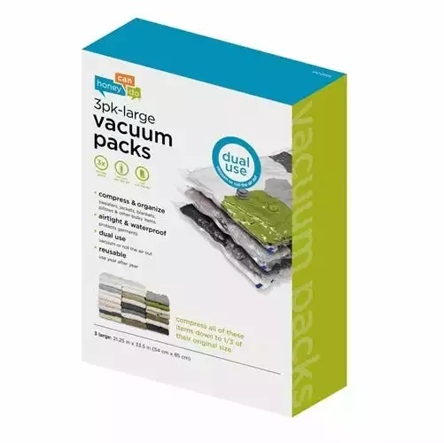 Honey-Can-Do VAC-01300 3-Pack Large Vacuum-Packs (21.25″x33.5″). Vacuum-Packs are vacuum sealed storage bags designed for compacting and storing everything from seasonal clothing to linens. Simply place your items into the bag, attach any hose-style vacuum cleaner, and watch as the air is removed and items compress into a smaller, manageable pack. Honey-Can-Do Vacuum-Packs protect your stored items from dirt, insects, and moisture keeping contents fresh and damage-free. These units are reusable making them an excellent value. Let Honey-Can-Do help you get organized today.