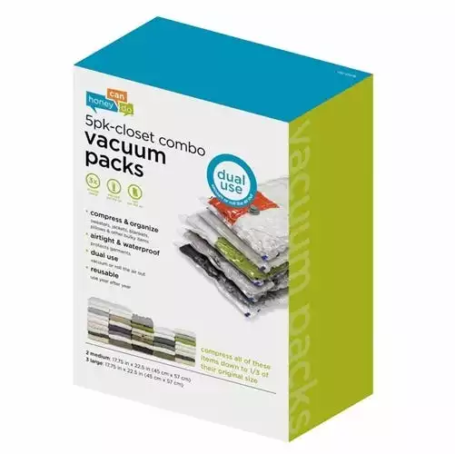Honey-Can-Do VAC-01378 5-Pack Super Storage Combo Vacuum-Pack (Multiple Sizes). Vacuum-Packs are vacuum sealed storage bags designed for compacting and storing everything from seasonal clothing to linens. Simply place your items into the bag, attach any hose-style vacuum cleaner, and watch as the air is removed and items compress into a smaller, manageable pack. Honey-Can-Do Vacuum-Packs protect your stored items from dirt, insects, and moisture keeping contents fresh and damage-free. These units are reusable making them an excellent value. Let Honey-Can-Do help you get organized today.