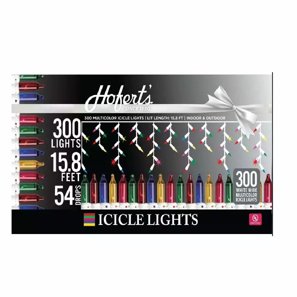(2) 150-light sets with end connector. Features 27 drops per set, 15.8 feet lighted length, and 22 feet total length. 7/ /6/7/ /6/7/ /5 per 50 lights. Ideal for indoor or outdoor use. Steady burn or 2-way flashing option. 16 inch lead in, 3 inch lead out, 3.5 inch spacing between drops, and 2.75 inch spacing between bulbs.