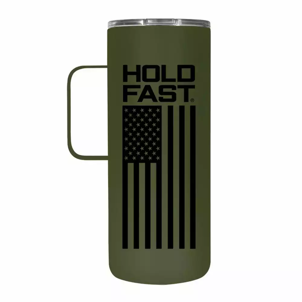 Take your love of this country on the road when you carry this patriotic “Freedom Flag” HOLD FAST® 22 oz. Dual-Wall Stainless-Steel Mug with Handle in Army Green. This contemporary handled mug is designed to fit most car cup holders, is sweat-free, and keeps drinks piping hot or ice-cold for hours. It’s a practical vessel for home, work, or the car.