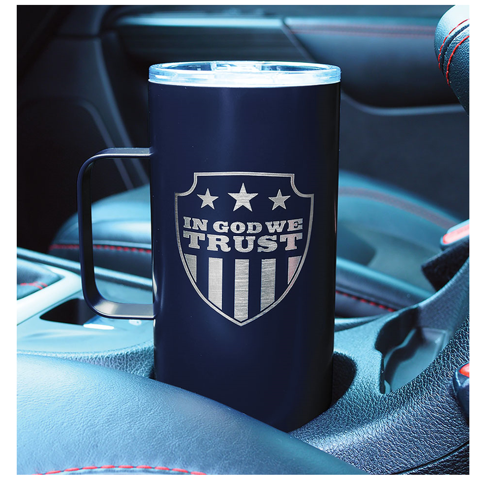 Make a strong statement of faith when you carry this patriotic “in God We Trust” HOLD FAST 22 oz. Dual-Wall Stainless-Steel Mug with Handle in Blue. This contemporary handled mug is designed to fit most car cup holders, is sweat-free, and keeps drinks piping hot or ice-cold for hours. It’s a practical vessel for home, work, or the car.