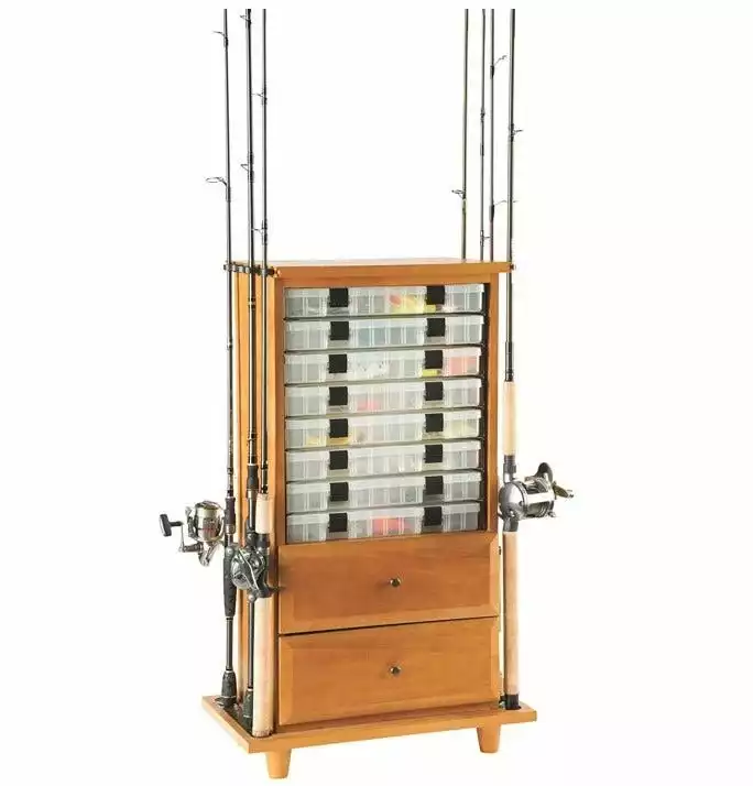 This Organized Fishing cabinet with 2 drawers is a great place to organize your fishing rods, combos and tackle. This unit holds eight 3700 series utility boxes (not included) and features 2 drawers for storing tackle, reels and accessories. The adjustable track rack system maximizes rod capacity. A variety of clip sizes is included to ensure the best fit for your gear. Comes mostly assembled — just screw on the top and bottom. Sturdy MDF and plastic construction with oak-colored finish makes an attractive addition to any room. 20.47in.L x 11.81in.W x 33.86in.H.