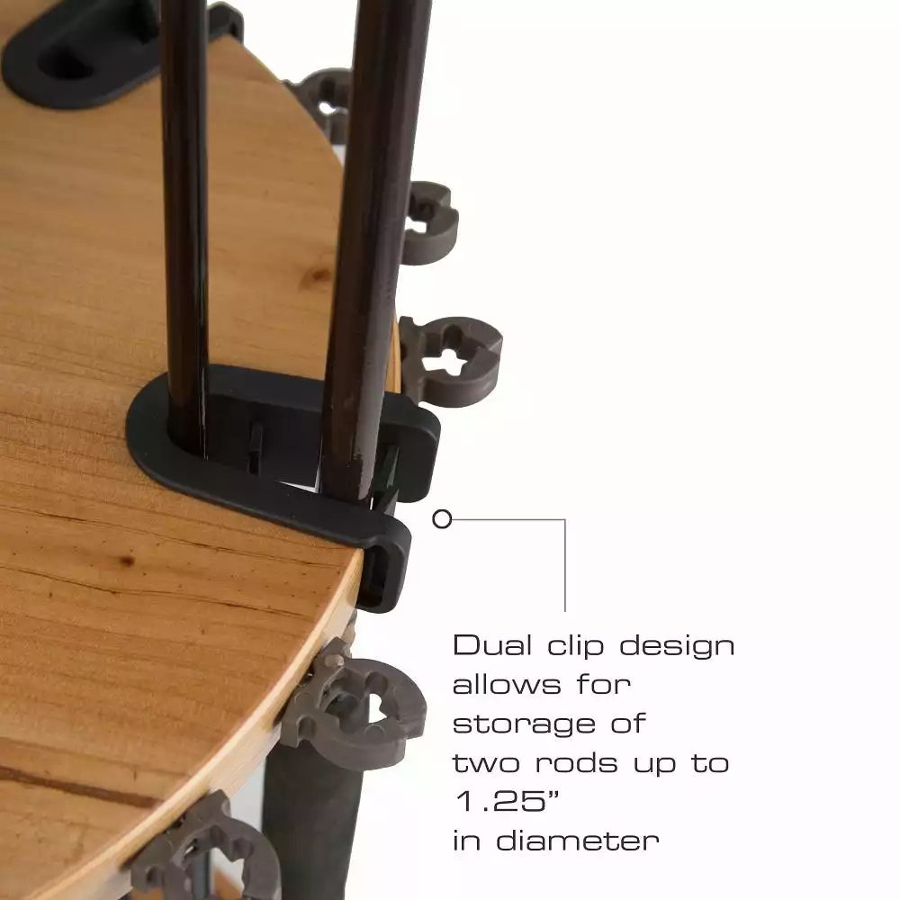 The only fishing rod rack you will ever need. The 24-Rod Rack possesses all of the markings of fine craftsmanship: A 1.5” extra-heavy base for enhanced stability. NEW dual rod clip technology (accommodates saltwater rods up to 1.25” diameter). Marine-grade/water-resistant finish adds luster to this rack. This rod rack measures 13.5” x 33” and here is the bonus: no tools easy assembly required.