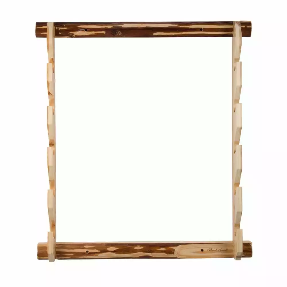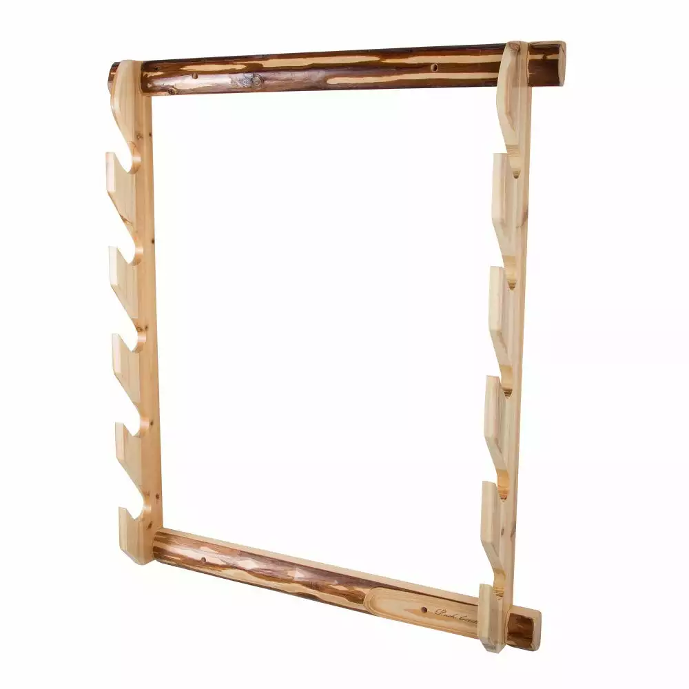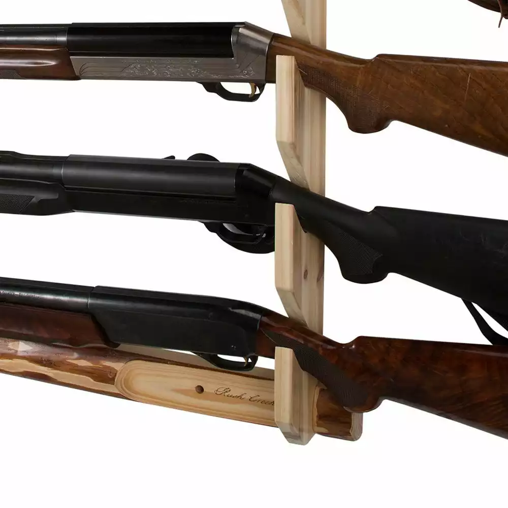 Secure and showcase your hunting supplies without sacrificing valuable space with this attractive Rustic Log 5 Gun Wall Rack from Rush Creek Creations. This beautiful, solid pine rack secures and displays up to 5 rifles, shotguns, and other shoulder-shot firearms on a durable and attractive wall rack. The wood is given two varnish treatments composed of a skip-peel finish and a polyurethane treatment to protect both the rack and your equipment from scratches or dents without compromising the classic cabin style. Heavy-duty mounting hardware is included to ensure the rack stays firmly in place on the wall of your cabin, mudroom, shed, garage, or anywhere you store and display your firearms. The deep groove channels were designed so that each gun rests securely in its place. When assembled, the rack measures 29.5″L x 4″W x 33″H. With its rustic charm and durable, sturdy design, the Rush Creek Creations Rustic Log 5 Gun Wall Rack is an essential item for any sportsman and hunting enthusiast. Includes 1 rack. Guns and accessories sold separately.