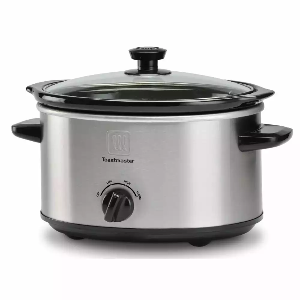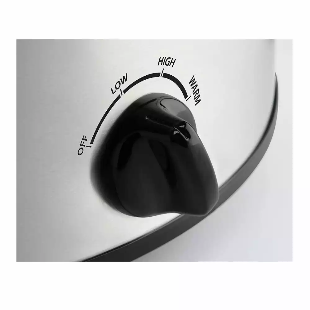 - 4-quart capacity slow cooker with stoneware insert, glass lid, and brushed stainless steel exterior
