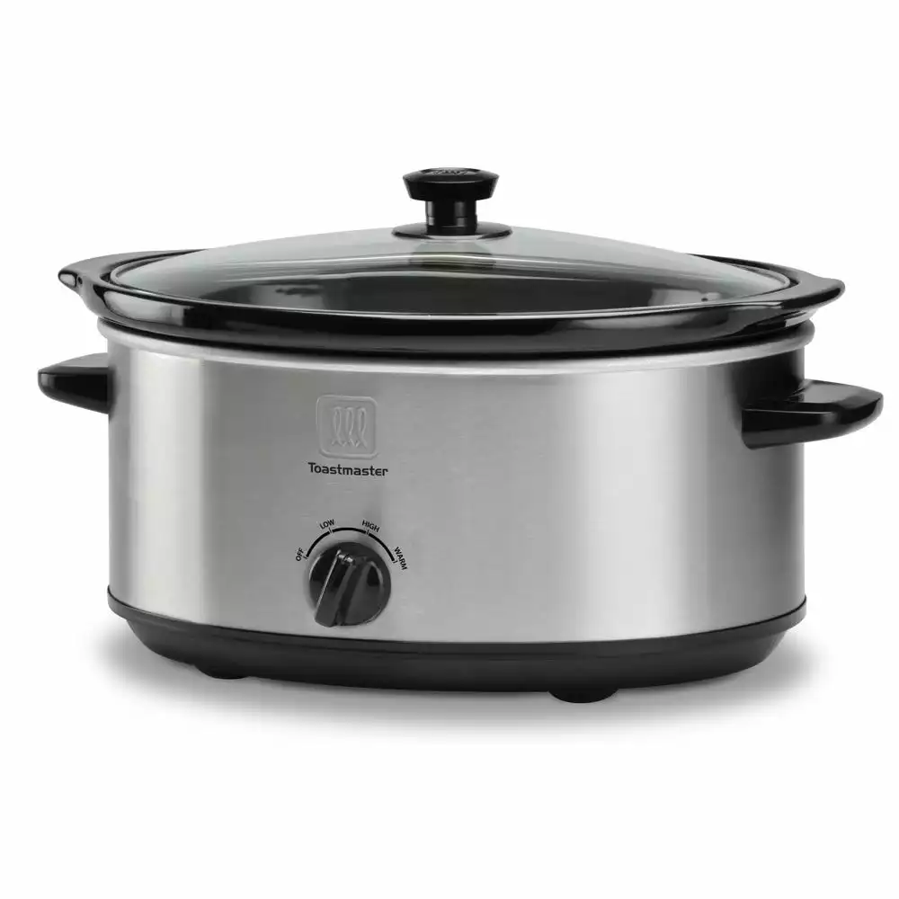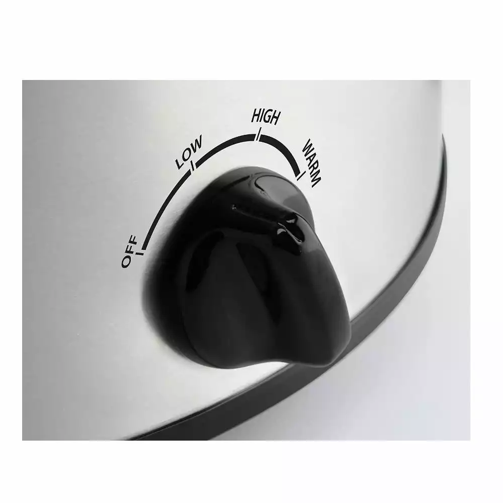 - 7-quart capacity slow cooker with stoneware insert, glass lid, and brushed stainless steel exterior