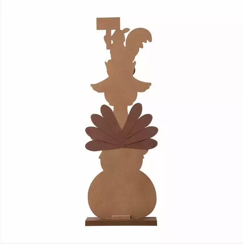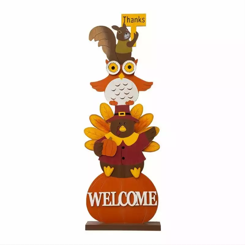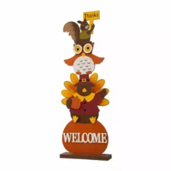 The wooden porch decor features a stacked squirrel,owl,turkey,Pumpkin. Designed with vibrant colors. colorful wings and 3D mouth, It looks like a funny gentleman standing at the door.Material in MDF and solid wood. Size 14.17″L X 3.94″W X 40.35″H