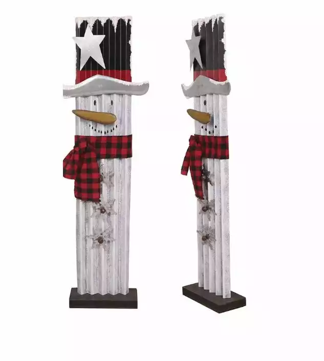 - The product features in wooden and metal material, style in a snowman and decorated with hat and scarf.