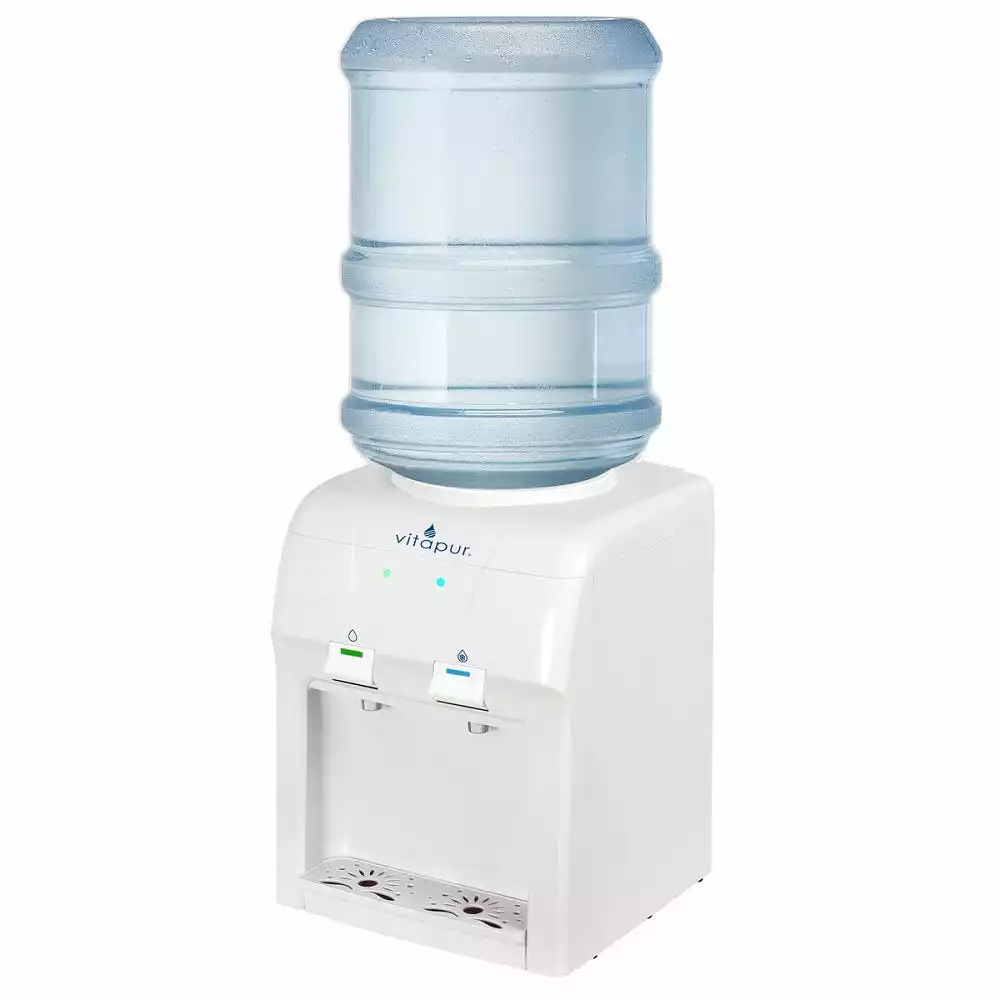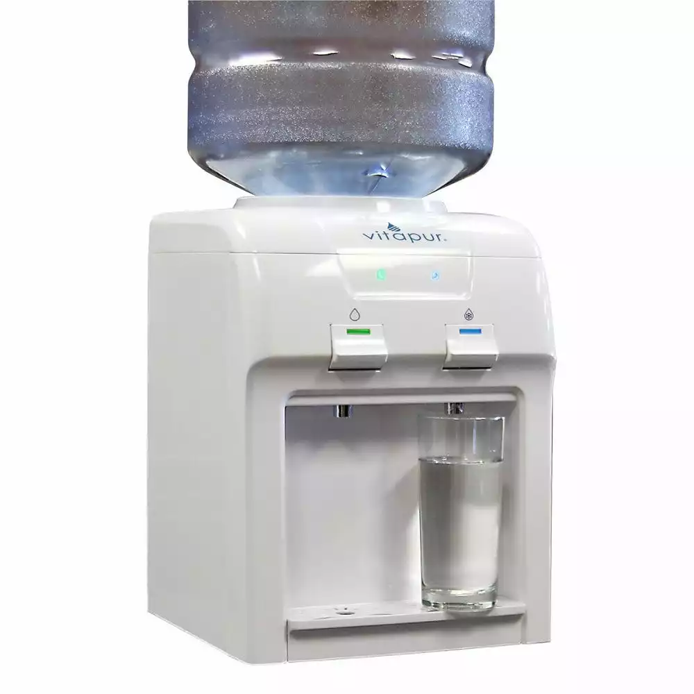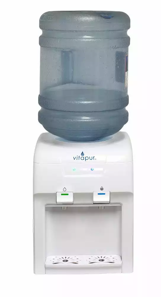 The Vitapur Countertop Water Dispenser features easy to use push button controls and dispenses cold and room temperature water. This compact design accommodates 3 or 5 gal water bottles and the semi-conductor electric cooling module provides whisper quiet operation. Convenient LED lights indicate power and when water has cooled to an ideal temperature. The removable drip tray & grill make clean up ease.
